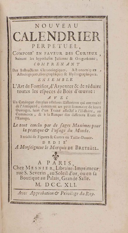 Nouveau Calendrier perpetuel, composé en faveur des curieux, suivant les hypotheses Julienne & Gregorienne; comprenant des instructions chronologiques, astronomiques, astrologiques, geographiques & hydrographiques. Ensemble l’art de fortifier, d’arpenter & de réduire toutes les especes de bois d’œuvre: avec un catalogue des plus célèbres historiens qui ont traite de l'Antiquité, contenant un petit sommaire de leurs ouvrages, suivi d'un traité affectif à l’histoire, au commerce, & à la banque des differens etats de l’Europe. Enrichi de figures & cartes en taille-douce.