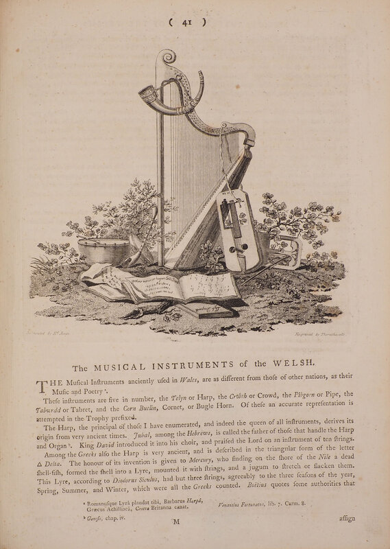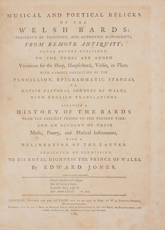 Musical and poetical Relicks of the Welsh Bards: preserved by Tradition, and authentic Manuscripts, from remote Antiquity; never before published. To the Tunes are added Variations for the Harp, Harpsichord, Violin, or Flute. With a choice Collection of the Pennillion, epigrammatic Stanzas, or, native pastoral Sonnets of Wales, with English translations. Likewise a History of the Bards from the earliest Period to the present Time, and an Account of their Music, Poetry, and musical Instruments, with a delineation of the latter...